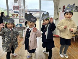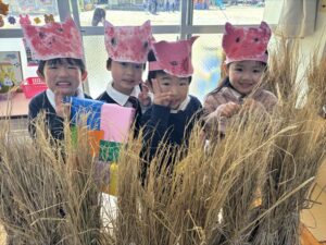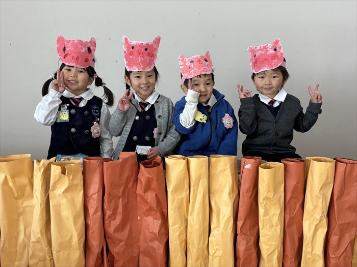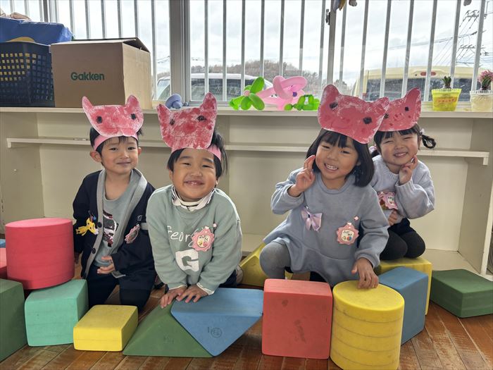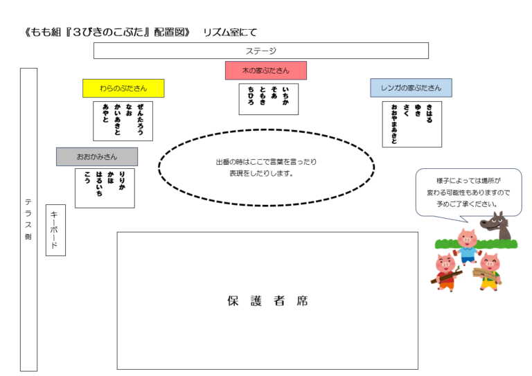 もも組 TOP Twitter Facebook はてブ Pocket LINE コピー 2025.02.172023.02.14 『言葉は心を伝える大切なもの』 <年少組> 自分の思いを伝え、友だちの思いを受け入れながら、共通のイメージを膨らませる。 この時期になると「今日は雨だから、お外で遊べないね」などと、文で自分の思いを伝えられるようになってきます。語彙も増え、休日の経験や感動したことを一生懸命伝えてくれる姿が見られています。一方で、 相手の思いをイメージすることには未発達な部分もあり、気持ちのすれ違いから、ちょっとした揉め事となることもあります。 今回、こども達は、言語的活動の一環として劇遊びに取り組んでいます。物語の役になりきることを通して、様々な感情や考えがあることに触れ、相手の気持ちを考える経験をしているところです。 メッセージ お使いの端末や回線速度によっては動画の読み込みに時間がかかる場合があります 配置図 サムネイルをタップすると拡大表示されます 配役 サムネイルをタップすると拡大表示されます おおかみさん レンガの家ぶたさん わらの家ぶたさん 木の家ぶたさん 取り組みの様子 サムネイルをタップすると鮮明な画像をご覧いただけます ①遊びの時間にもこぶたさんの絵を描いて、友だちとイメージの共有を楽しんでいました。②話の流れを理解し、場面に合わせて自分たちで道具を準備しています。③友だちと一緒に頑張るって楽しいね!役のイメージを膨らませて伸び伸び表現しています④役になりきると、自然と言葉に合わせた表現がでてくるようになりました。⑤本物のわらに触れ、「ちくちくするね」「いい匂い~」とよりお話のイメージが深まりました。⑥身近にあるものを使って、自分たちのイメージを表現します。⑦絵本読みで1番盛り上がる場面!本当に吹き飛ばす勢いで表現しています。⑧れんがのお家を作成中!筆の持ち方や塗り方を考えながら取り組みました。⑨「火を準備しないと!」手先を使って小さくテープをさいて、ゆらゆら揺れる炎を作りました。⑩「どうやったら強いオオカミに見えるかな?」友だちの素敵なところを真似ながら、表現方法を考えました。⑪人気の運動遊びを取り入れて劇遊びを楽しんでいます。